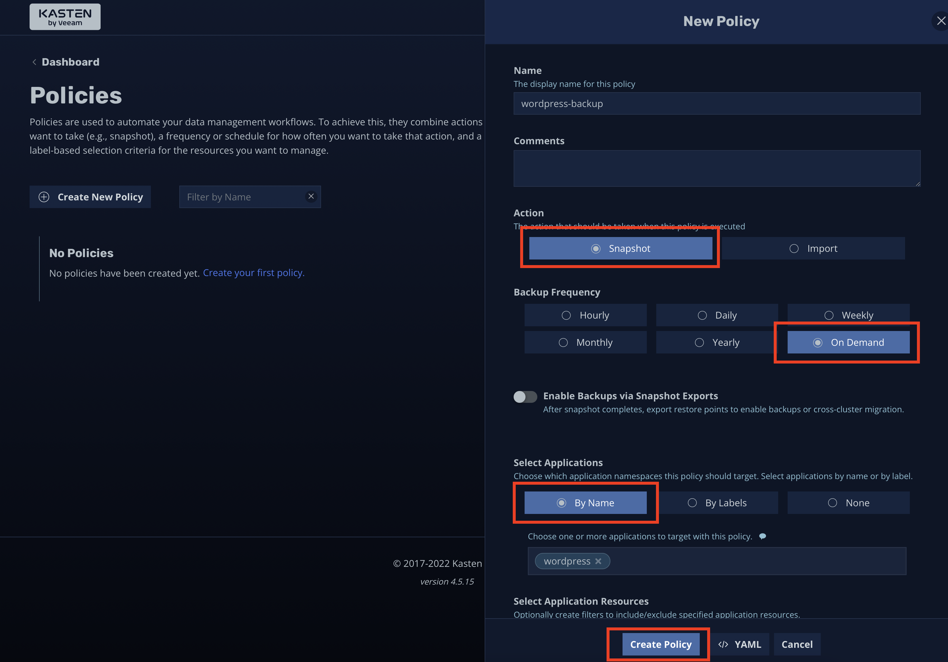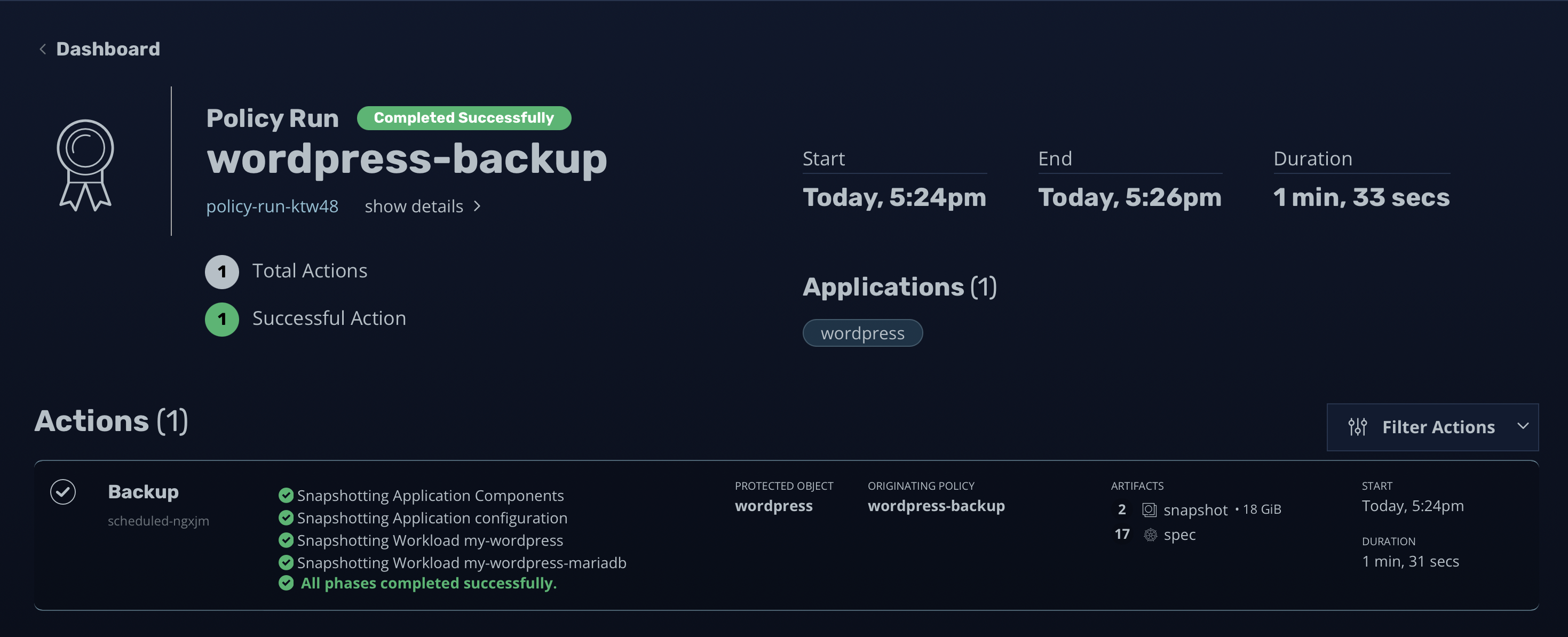 - Dashboard 에서 Backup Policy 생성 후 실행