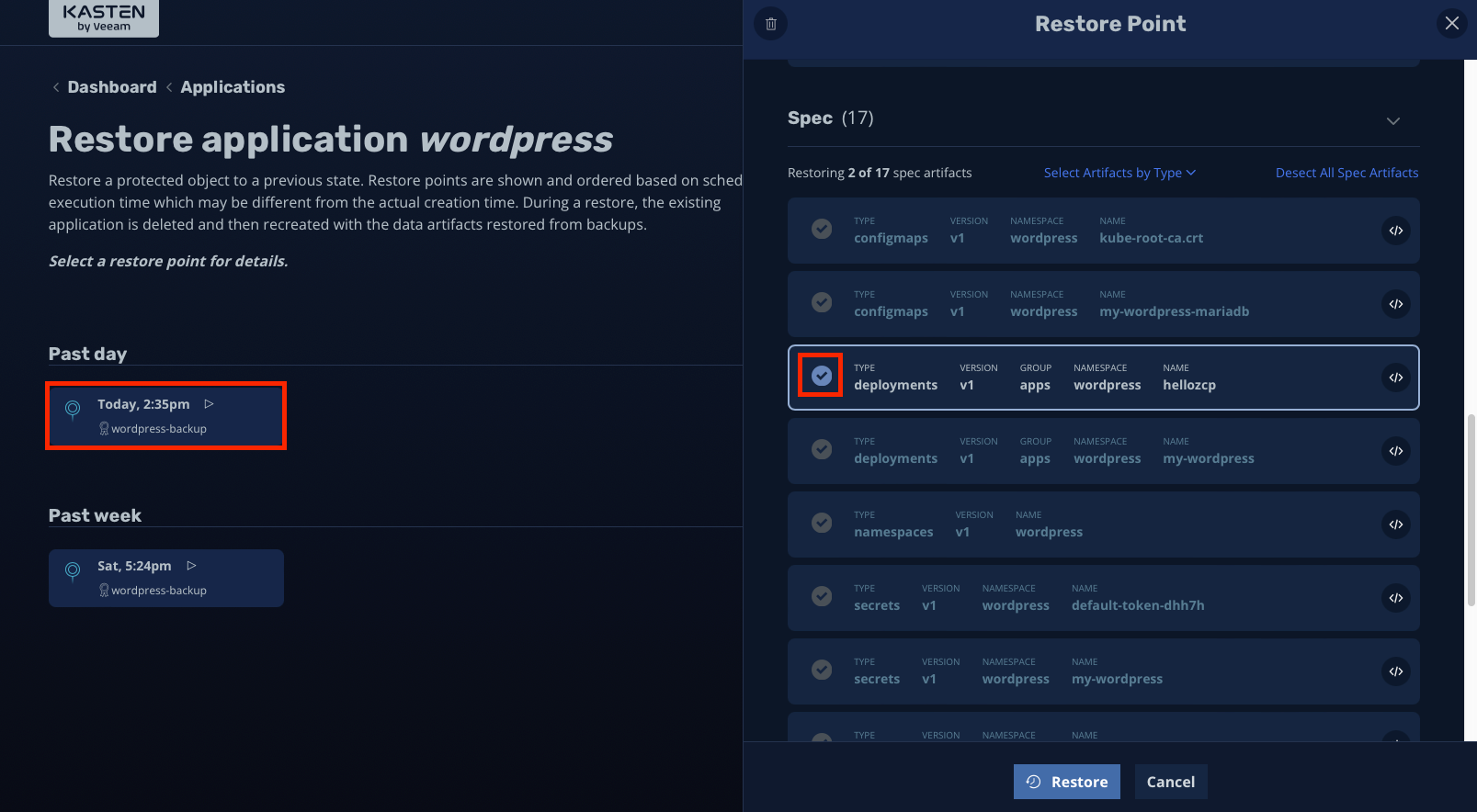 - 백업한 리소스 중 특정 리소스만 선택하여 별도의 namespace (wordpress-hellozcp) 상에서 복구 테스트