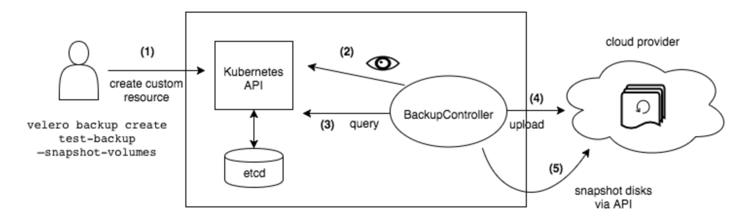 - The Velero client makes a call to the Kubernetes API server to create a Backup object.