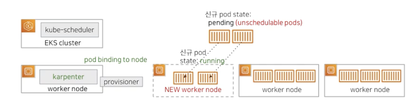 - 노드가 배포 되면 karpenter 가 직접 해당 노드로 바인딩