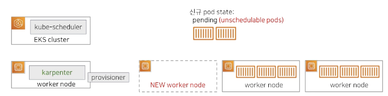 - 가용 노드가 없어 Pod 가 배치되지 못하면 Karpenter 가 해당 사실 인지