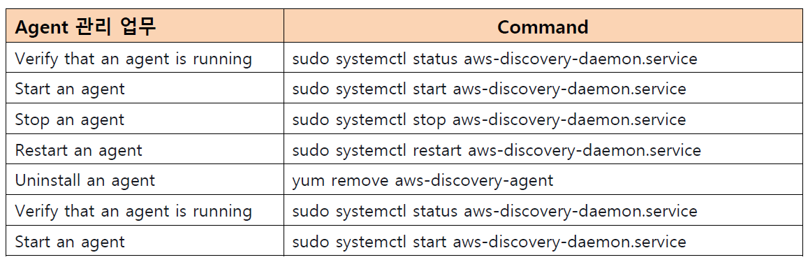 AWS Discovery Agent는 검색 및 마이그레이션을 위해 대상으로 지정된 On-premise 서버 및 VM에 설치하는AWS 소프트웨어입니다. 에이전트는 시스템 구성, 시스템 성능, 실행 중인 프로세스 및 시스템 간 네트워크 연결에 대한 세부 정보 등을 캡처합니다. 에이전트는 대부분의 Linux와 Windows 운영 체제를 지원하며, 물리적 온프레미스 서버, Amazon EC2 인스턴스, 가상 머신에 배포할 수 있습니다.