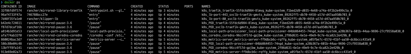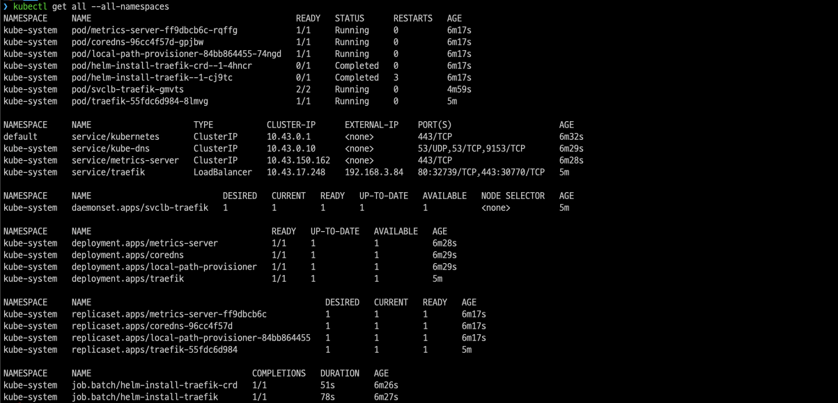 - 설치가 완료가 되면 K3s가 떠있으며, 아래 처럼 관련 container 및 Kubernetes Object들을 확인할 수 있습니다.