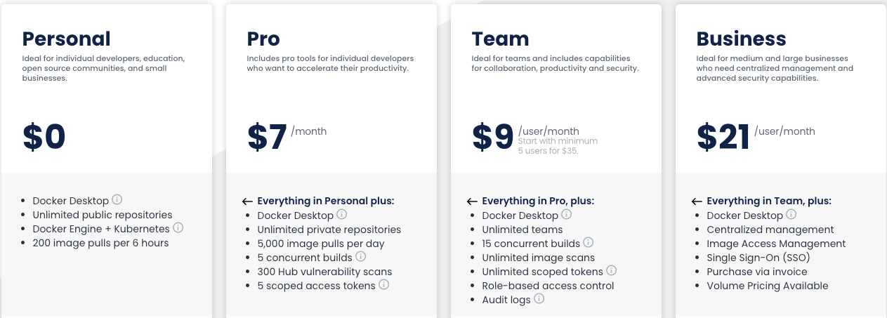 - 구독 모델별 세부 기능 및 비용은 https://www.docker.com/pricing 에서 확인 가능합니다.